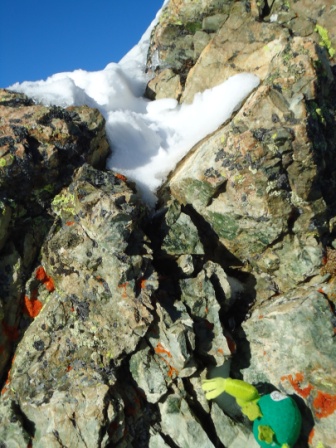 | Mit einer unerwarteten Überraschung: Die von weitem stolze Haltung des posierenden Bergsöts entpuppt sich zusehends als starrer Blick in die Ferne, wohl bereits in Vorausahnung des halsbrecherischen Abstiegs. |