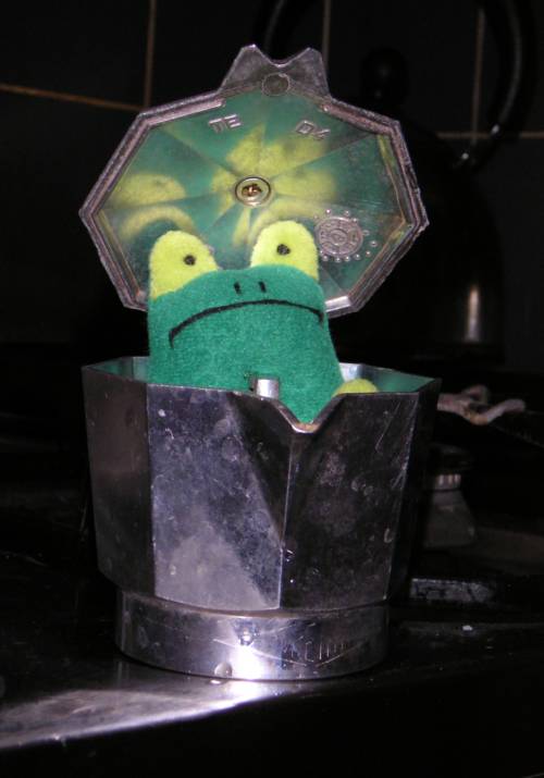 mit Söt: Einen Frosch "im" Hals haben (1) Versuch, obenstehendes in die Tat umzusetzen (2) Bisweilen versucht sich Söt als Wetterfrosch, mit bescheidenem Erfolg (3) |